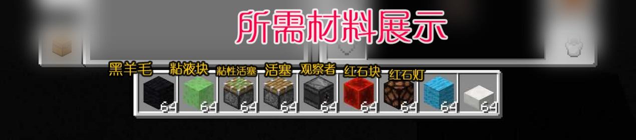 首先,制作小车我们需要用到的材料如下:羊毛*4个(用来做轮胎,这次用黑色)、粘液块*若干、粘性活塞*1个、活塞*1个、观察者*1个、红石块1个