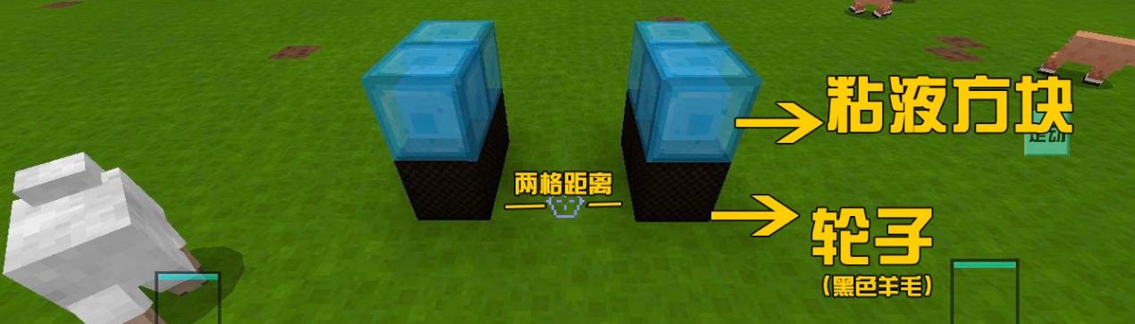 接下来左边粘液方块上放一个粘性活塞,对角上的粘液方块接一个普通活塞。注意,一定要走到两排轮子之间,面对着粘液方块内部放活塞,如果错了最后塞子怼的方向也是错的,车会解体哦。