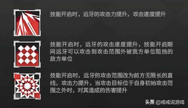 三技能开启后攻击范围变成前方无限长的直线,攻击力提升,而且当攻击目标位于自身初始攻击范围之外时,对其造成的伤害提升。