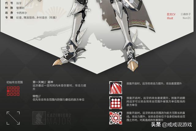 远牙的第一天赋是凝神,如果最近一段时间内没有受到伤害,她的攻击力就会提升。也就是说想让她输出高一些的话,就务必要派人保护好她。好在她的射程很远,这一点还是很容易能满足的。特性是优先攻击攻击范围内防御力量最低的干员,这就需要把队伍的阵型整体往前移,不然攻击范围内的小杂兵可能会吸引火力。