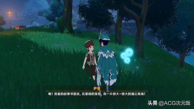 这一幕让人不禁想起萨基口中的蒲公英海。在原神玩家和蒙德里的男孩NPC萨基对话是,他会告诉玩家他在《蒲公英海的狐狸》这本书里听说过,蒙德的某处有片很大的蒲公英海。而这块石门的位置正好在蒙德,但是进入之后地图却已经显示在海面上,这是否意味着蒲公英海其实在蒙德的边境或者已经到了水之国枫丹?
