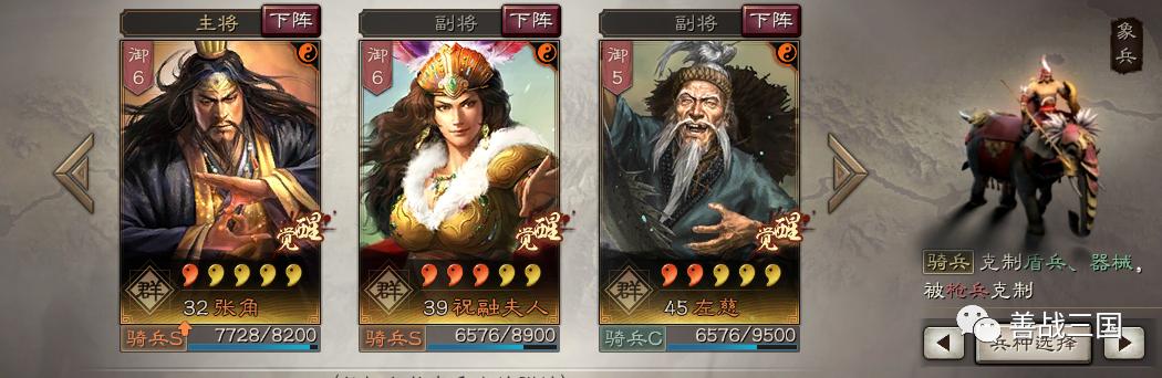 再配个群阵营里能单核打出爆炸伤害的C位将:常见的有组袁术的,不过善战觉得袁术偏向爆发,战法搭配有点复杂,所以选了张角(刚好有骑散记)这个简单点的,也是上限非常高的,后续实战试试。