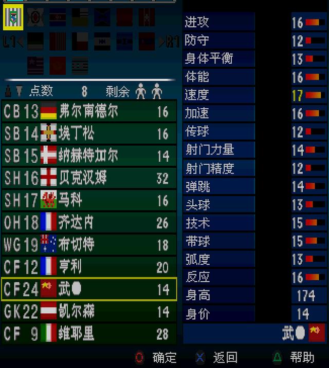 价格14,速度17,加速16,射门力量14,精度12,头球13,弹跳14,传球12,身体平衡13。