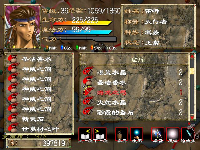 4、在战斗地图上拾取。一类是隐藏道具,踩在某个坐标上即可获得。此类道具往往对游戏进程大有帮助:如幸运缎带、凝气之环、白光之翼、冥晦之轮等。但隐藏点坐标难以踩准,建议看攻略并结合pos秘技开坐标。另一类是从“遗产”为代表的关卡中搜刮。可得大量顶级装备,如龙牙、暗黑剑忌魂、鬼斧丧神、暗黑刀血祭、圣矛炽天使等。