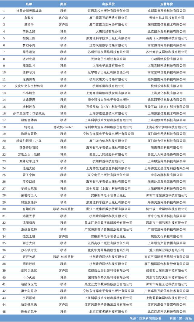 在此次获批版号的45款游戏中,有37款移动端游戏,5款客户端游戏,2款休闲益智类手游,1款Switch游戏。获得版号的知名游戏厂商包括吉比特旗下的雷霆网络、心动网络、游族网络、恺英网络、创梦天地、莉莉丝、4399、金山软件以及百度多酷等。