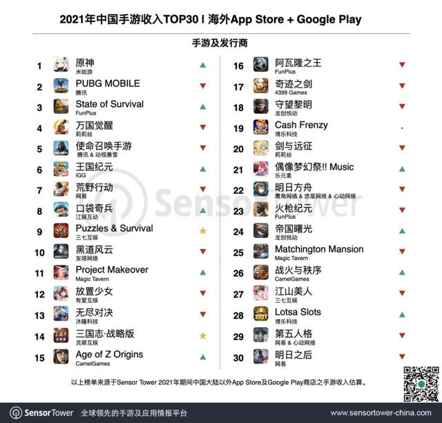 Sensor Tower数据显示,2021年共42款中国手游在海外市场的收入超过1亿美元,出海收入TOP30手游产品在App Store和Google Play的总收入达到115亿美元。