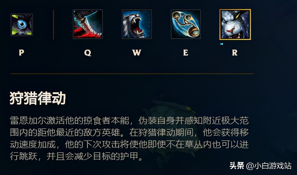 4技能:狮子狗获得40%/50%160%移动速度和在2500/3000/3500码内距他最近的敌方英雄的真实视野,持续12/16/20秒。在最初的2秒后雷恩加尔进入伪装状态,并且即使不在草丛里时也可以跃向一名敌人。跃向最近的敌人会造成(50%*AD)物理伤害并使目标的护甲减少12/18/24,持续4秒。1600码内的敌方英雄及其附近的友军都可以感知到处于【狩猎律动】状态的雷恩加尔。被【狩猎律动】所显形的敌人只要呆在追踪范围内就会处于被显形状态。攻击或施放大部分技能都会让狩猎律动】结束。潜行-伪装这个角色不会被敌方单位所看见。附近的敌方英雄和敌方防御塔会使其显形。