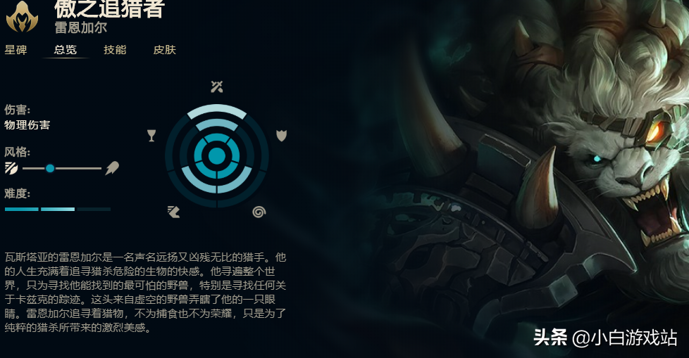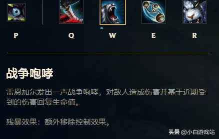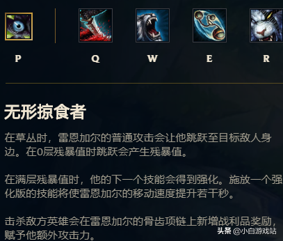 被动技能: 在草丛时,狮子狗的普通攻击会让他跳跃至目标敌人身边。在0层残暴值时跳跃会产生残暴值。在满层残暴值时,他的下一个技能会得到强化。施放一个强化版的技能将使雷恩加尔的移动速度提升若干秒。击杀敌方英雄会在雷恩加尔的骨齿项链上新增战利品奖励赋予他额外攻击力。