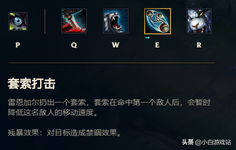 3技能:三技能是狮子狗的控制技能,可以用在先手或者追击时候使用扔出一个套索,对命中的第一个敌人造成55/100/145/190/235(+80%*额外AD)物理伤害,并将目标减速持续1.75秒。残暴效果:造成50~305(1-18级每级+15)(+80%*额外AD)物理伤害并禁锢目标1.75秒。产生1点残暴值