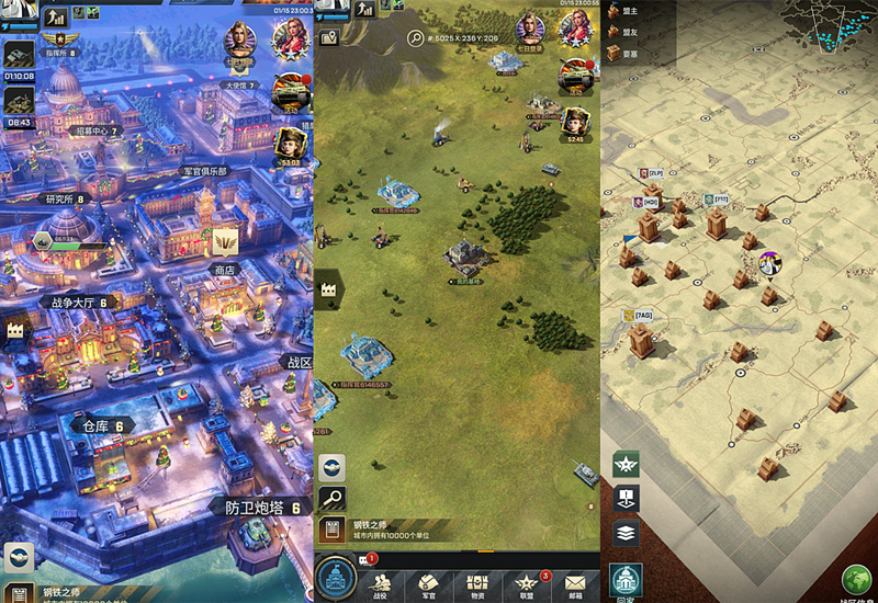 然后是游戏的世界场景,第一幅图是我们主城基地,第二幅是出城后的大地图,第三个则是真正的大地图。玩过这类游戏的玩家,对这个模式并不陌生,就是简单的养成、经营玩法。给主城建造升级,其他的附属建筑升级这样的。