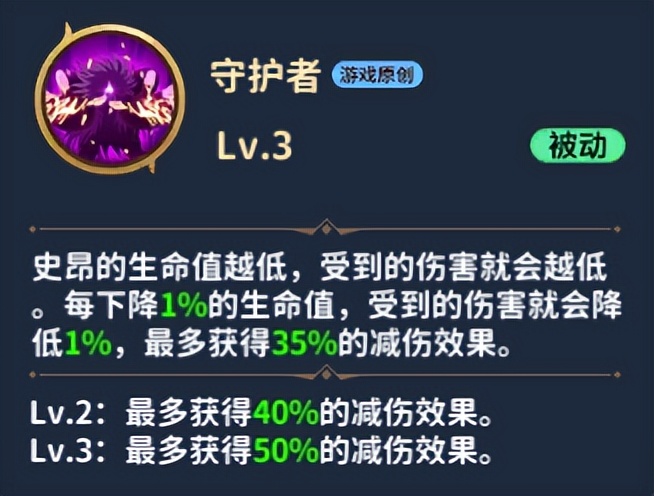 史昂的生命值越低,受到的伤害就会越低。每下降1%的生命值,受到的伤害就会降低1%,最多获得35%的减伤效果。
