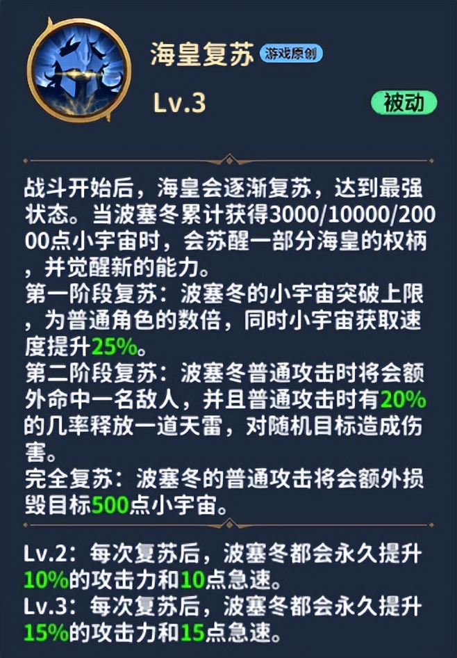 Lv3:每次复苏后,波塞冬都会永久提升15%的攻击力和15点急速。