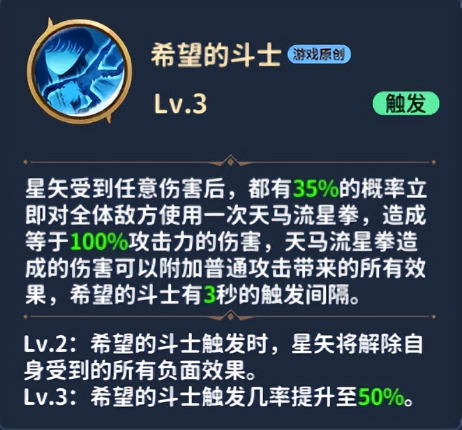 星矢受到任意伤害后,都有35%的概率立即对全体敌方使用一次天马流星拳,造成等于100%攻击力的伤害,天马流星拳造成的伤害可以附加普通攻击带来的所有效果,希望的斗士有3秒的触发间隔。