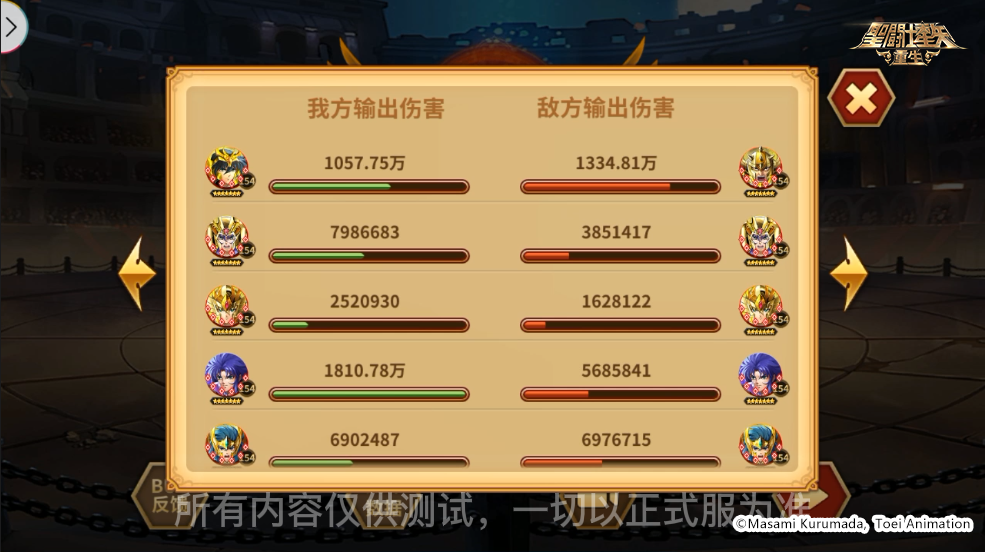 输出对比中,我方后排输出角色冥衣·撒加位列第一,两名主T传说圣斗士·紫龙、神圣金牛座·阿鲁迪巴占据了二、三名的位置。对方主要输出角色在本场战斗中发挥不佳,这个得益于传说圣斗士·紫龙配合两名撒加对敌方造成了长达10秒的壁咚,圣剑多次覆盖到敌方全体降低了双防,使得脆弱的中后排角色率先“阵亡”。