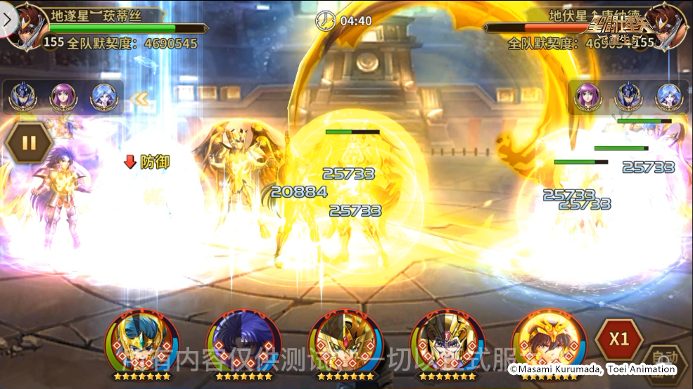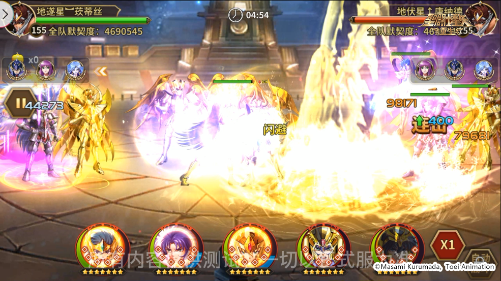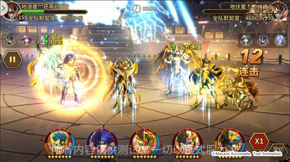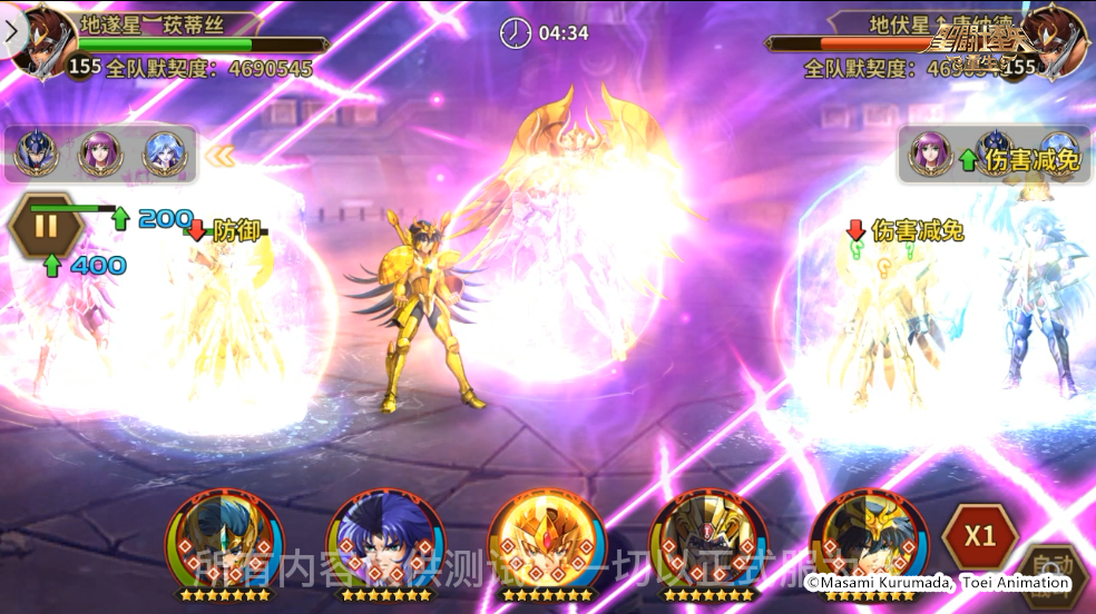 对方阵容:神圣金牛座·阿鲁迪巴、神圣处女座·沙加、神圣水瓶座·卡妙、冥衣·撒加、神圣双子座·撒加
