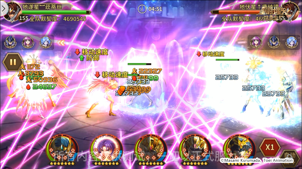 我方阵容:传说圣斗士·紫龙、神圣处女座·沙加、神圣水瓶座·卡妙、冥衣·撒加、神圣双子座·撒加