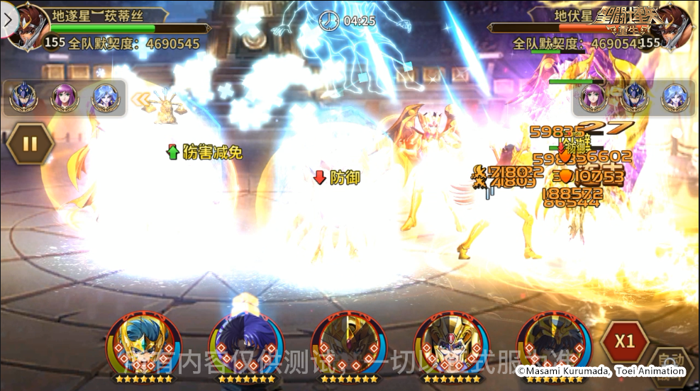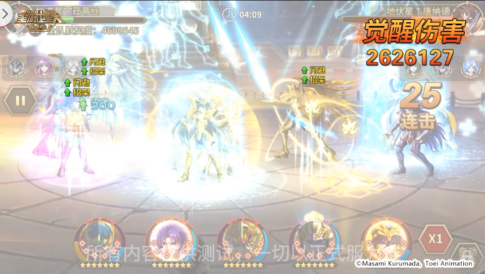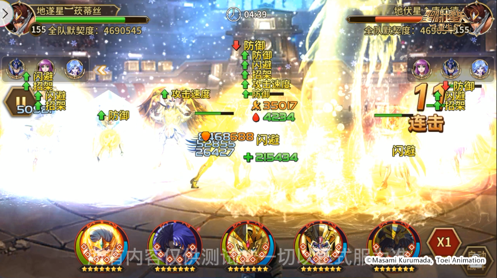 战斗开始,传说圣斗士·紫龙释放必杀技击飞了神圣处女座·沙加、神圣水瓶座·卡妙,落地后造成了3秒的眩晕效果。