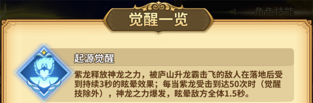 第一种是必杀技庐山升龙霸将敌方击飞落地后的眩晕3秒,加强了传说圣斗士·紫龙的控制、壁咚能力,虽然覆盖范围略逊色于觉醒·童虎的必杀技,但其缺乏免疫大部分控制和僵直效果,对战中容易被限制,因此开启起源觉醒后的传说圣斗士·紫龙的必杀技可以理解为觉醒·童虎的进阶版;第二种是被动技能,受击达到50次会眩晕敌方全体1.5秒,作为主T较容易触发,特别是面对技能段数较多的敌人时,效果更佳,在壁咚、反壁咚方面有一定的作用。