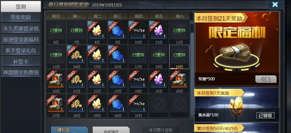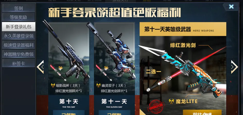 方法一:在签到界面,会有新手奖励英雄级武器,和积累登陆180天奖励英雄级武器。这对于新手是一个不错的福利(就是武器不是很强)