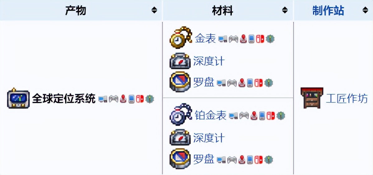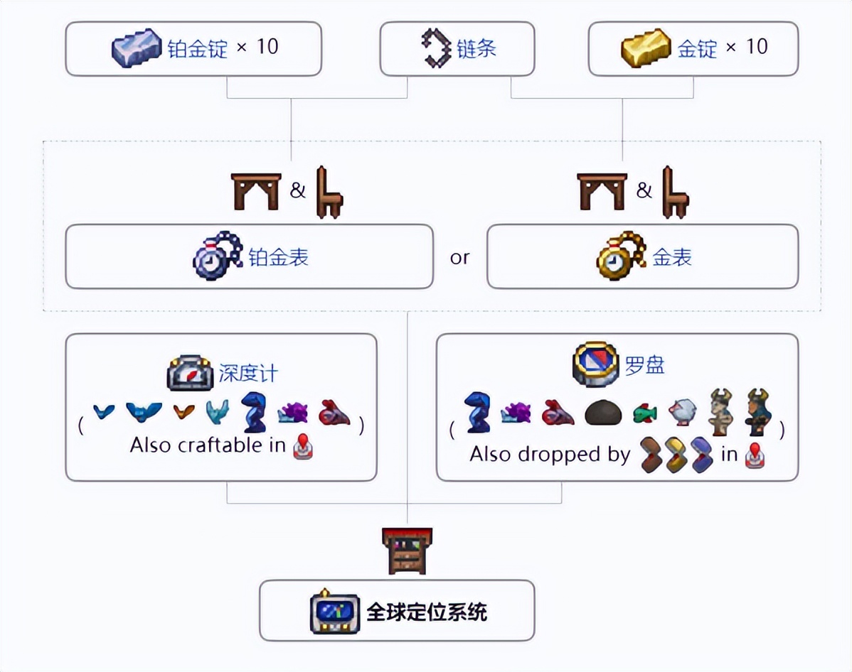 泰拉瑞亚游戏中玩家可在制造台制作出各种道具,其中有着一个名为全球定位系统的道具十分的有用,能够显示玩家的位置、深度和时间。很多玩家想知道泰拉瑞亚全球定位系统怎么合成,接下来为大家带来全球定位系统合成配方与制作树分享,一起来了解一下吧。