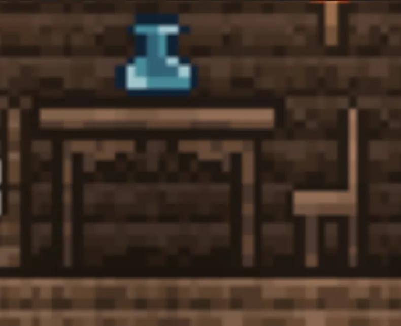 #泰拉瑞亚冒险日记#制作药水首先需要制作台,桌子加椅子上面放个瓶子即可,工作台加椅子瓶子(也可以)