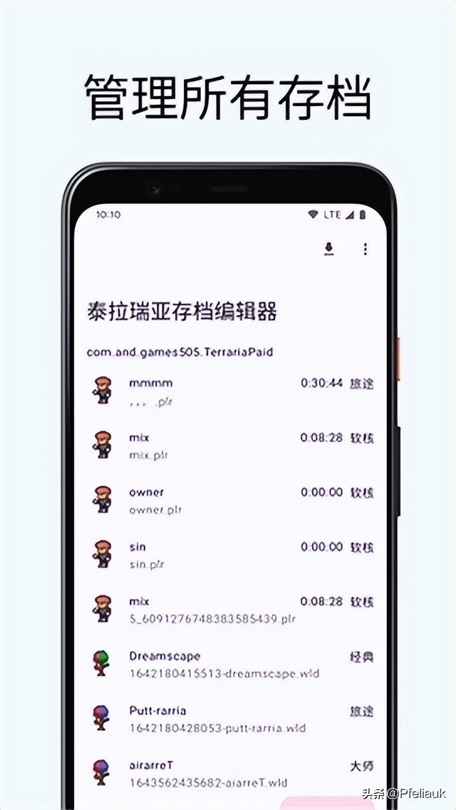 众所周知,泰拉瑞亚是一款十分出色、十分受人欢迎的高自由度的沙盒游戏,它凭借着其复古的2D像素风格、丰富的色彩、自由的创作性以及富有挑战性的战斗,让千万玩家都对其爱不释手!但是呢,正是这么一款优秀的游戏想要进行存档编辑却十分的麻烦,所以呢,为了帮助玩家完美的解决这一问题,今日小编特为大家带来了泰拉瑞亚存档编辑器手机版,顾名思义该软件工具是专为泰拉瑞亚手机版游戏所打造的一款存档编辑器工具,通过它用户们既可以快速的编辑泰拉瑞亚的存档,也可以快速的将存档进行导入、进行备份,以此让广大的泰拉瑞亚玩家们可以更好的进行游戏,是不是十分的不错呢?不仅如此哦,软件的不仅界面十分的简约清新,而且其操作也是十分的简单,玩家们只需寥寥的几个步骤即可完成存档、完成编辑,但为了一些不知道如何使用本工具的玩家也能快速的上手,小编在下文还准备了详细的使用教程哦,是不是十分的贴心呢?那大家还在等什么呢,不妨前来本站下载一试吧!