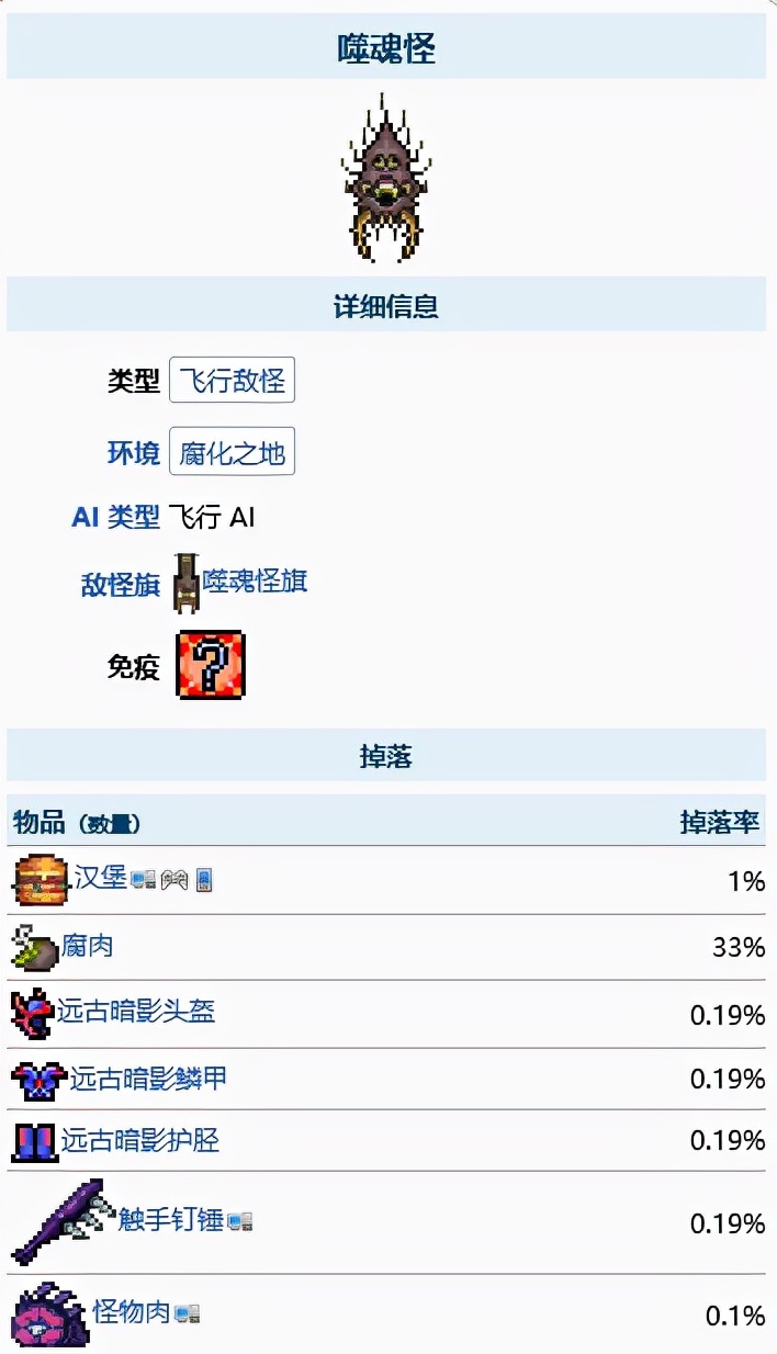 在泰拉瑞亚这款游戏中,远古暗影套装的获得方法是击杀噬魂怪。远古暗影套装是由远古暗影头盔、远古暗影鳞甲和远古暗影护胫组成,这三件装备都是由噬魂怪掉落获得,且这三件装备的掉落概率都是0.19%。