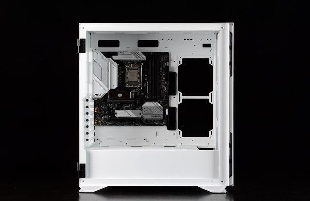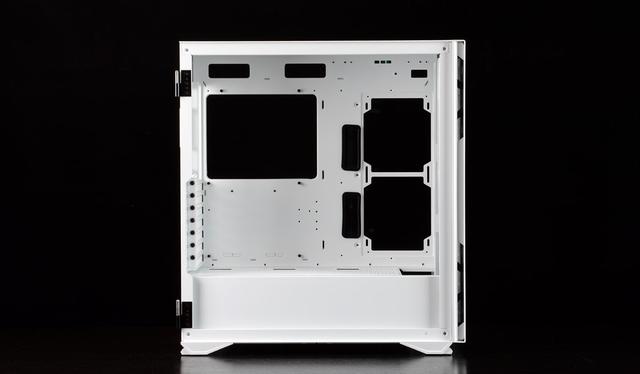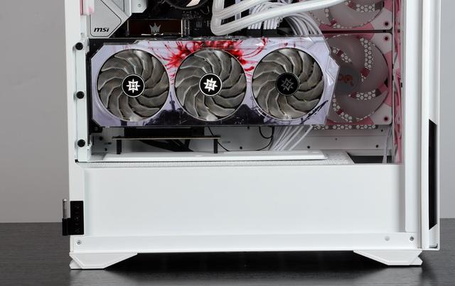机箱内部,最大可支持E-ATX主板安装,同时也能向下兼容其他规格主板。散热方面最大可支持360水冷安装,含水冷风扇在内最多可安装9把风扇。机箱显卡PCIE插槽可全部拆卸,搭配显卡支架和延长线可以轻松实现显卡竖装。