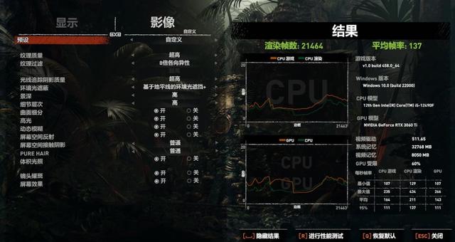另一款3A大作《古墓丽影·暗影》基准测试中,DLSS跟光追都拉满,游戏平均帧率也能达到137FPS