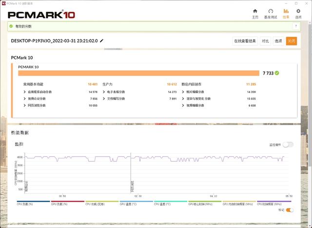 PCMARK10测试中,常用基本功能得分10481,生产力测试得分10612,数位内容创作得分11285,整体表现也都还不错。