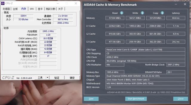 内存方面,不带K的12代酷睿,想XMP 4000 G1难度太大(除非中大奖,遇到体质特别好的U),不过XMP 4000MHz还是能轻松驾驭,除了延时较高,读写复制方面表现都足够优秀。