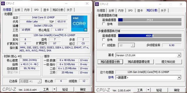 CPU-Z跑分测试,单核得分713.1,多核得分4921