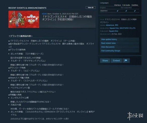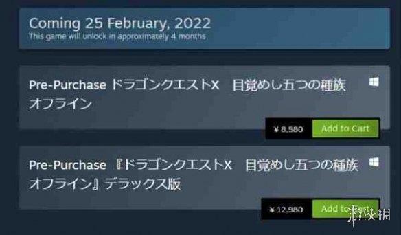 SE旗下《勇者斗恶龙10:觉醒的五个种族 离线版》现已上架Steam(目前仅在日服上线),游戏预购已开启。商店也显示本作仅支持日语,售价为8580日元(约合人民币495元)。