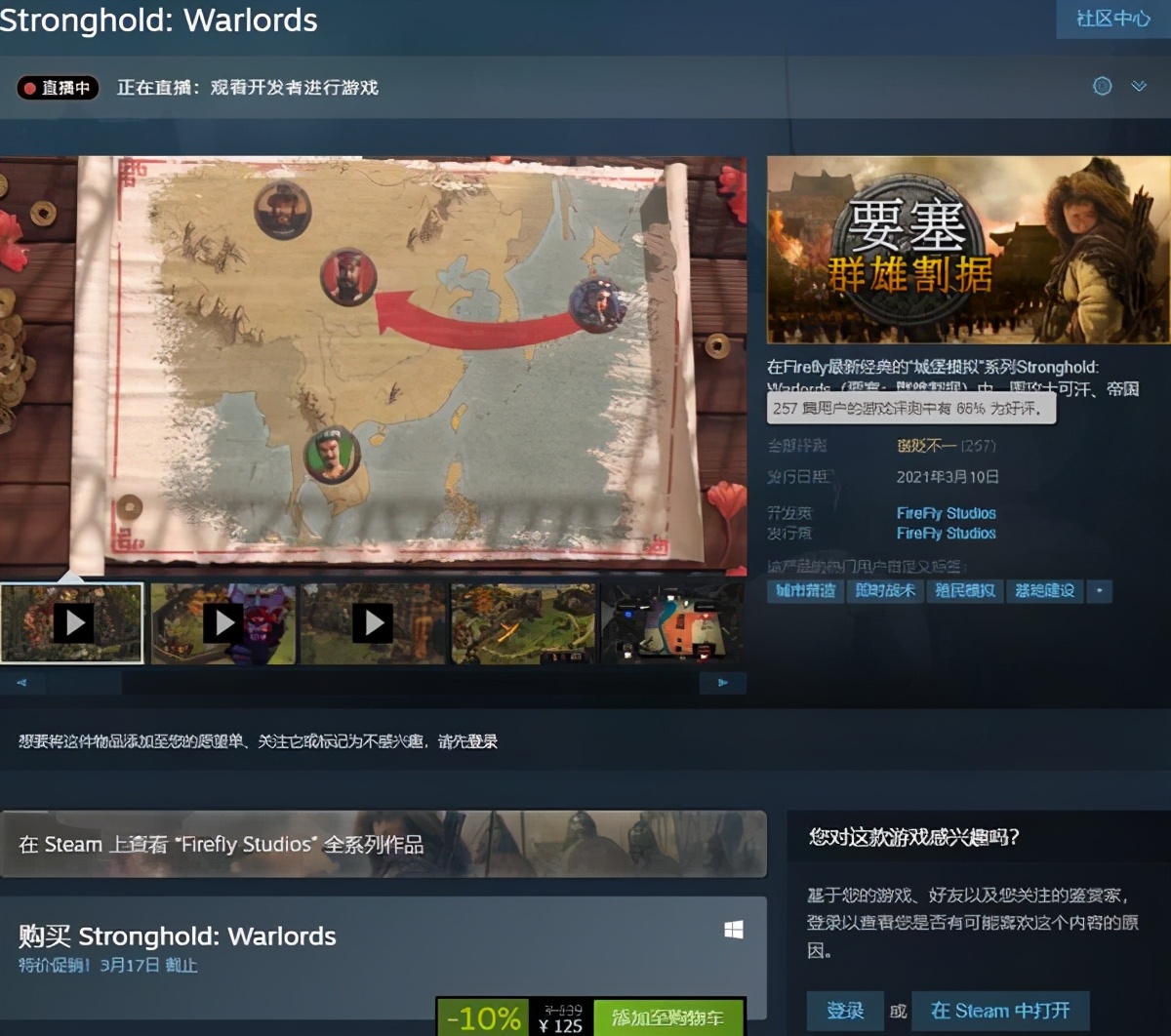 FireFly Studios制作发行的RTS《要塞:军阀之战》于今日(3月10日)正式发售,目前游戏在Steam首发限时特惠,国区仅售125元。截止发稿时,游戏Steam页面共收录用户评测257篇,其中仅有66%玩家给予好评,总体褒贬不一。玩家表示,游戏BUG一堆,看起来更像是半成品,毫无诚意。