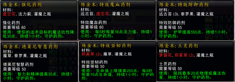 强化药剂:使你的法术目标抗性降低30点,持续1小时,法系DPS有点用处,收益不明显,基本无用。