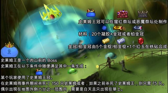 在泰拉瑞亚中有三种方法可以召唤史莱姆王。分别是使用史莱姆王冠、在史莱姆雨期间击杀大量史莱姆与在白天地图边缘六分之一的草地上生成。史莱姆王冠在腥红祭坛或者恶魔祭坛处制作,需要的材料为20个凝胶加上金冠或者铂金冠,其中金冠与铂金冠所需要的金矿、铂金矿与红玉都可以在地下挖矿获得。在没有击败过史莱姆王时,在史莱姆雨期间需要击杀150只以上的史莱姆才会召唤史莱姆王,而如果击败过史莱姆王,则只需要75只。地图边缘六分之一也就是地图两段的六分之一范围内。