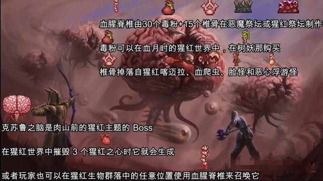 克苏鲁之脑是腥红世界的专属boss,召唤方法与细节和世界吞噬者类似,一是在腥红之地使用血腥脊椎,血腥脊椎由30个毒粉与15个椎骨在腥红祭坛制作。毒粉由树妖在血月时出售,椎骨则掉落自腥红喀迈拉、血爬虫、脸怪与恶心浮游怪。第二个召唤方法是在腥红生态的地下摧毁三个腥红之心。