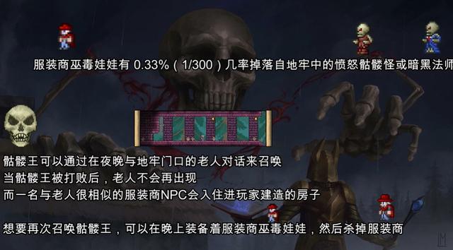 玩家只有击败了骷髅王后进入地牢才不会碰到一击就能秒杀玩家的地牢守卫。而召唤骷髅王有两种方法,第一个非常简单,在晚上与地牢门口的老人对话即可。第二种方法就是在击败骷髅王后,会有一个服装商NPC入住,在晚上装备服装商巫毒娃娃后,杀掉服装商即可召唤骷髅王。