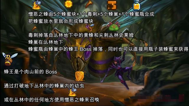 蜂王是丛林的boss,有两个召唤方法,第一个是在丛林中使用憎恶之蜂召唤。憎恶之蜂由蜂蜜块、毒刺、蜂巢与蜂蜜瓶合成。蜂蜜丢进水利形成蜂蜜块,毒刺则由击杀黄蜂与尖刺丛林史莱姆掉落,蜂巢在丛林地下挖,蜂蜜瓶则是用瓶子装蜂蜜获得。第二个召唤方法则是打破地下丛林中蜂巢内的幼虫召唤。