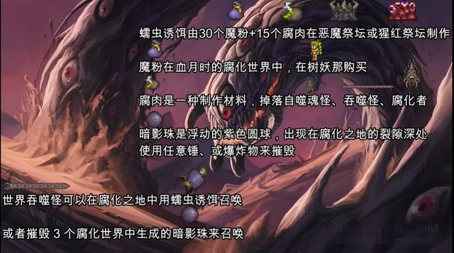 世界吞噬者是腐化世界的专属boss,有两个召唤方法,一是在腐化之地中使用蠕虫诱饵,蠕虫诱饵由魔粉与腐肉在恶魔祭坛处制作。魔粉会在血月时由树妖出售,腐肉则是击杀噬魂怪、吞噬怪与腐化者掉落。第二个召唤方法是在腐化生态的地下摧毁三个暗影珠来召唤,暗影珠可以用炸弹或者锤子摧毁。需要注意的是世界吞噬者不会离开腐化地形,因此也可以摧毁三个暗影珠后马上回城。