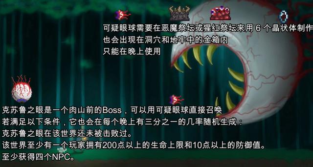 泰拉瑞亚中有两个办法召唤克苏鲁之眼,第一种是通过六个由恶魔眼掉落的晶状体在恶魔或者腥红祭坛处制作。第二种则是当玩家没有击败过克苏鲁之眼、血量200以上,防御10以上,且有四个NPC入住时,有三分之一的概率在晚上生成。