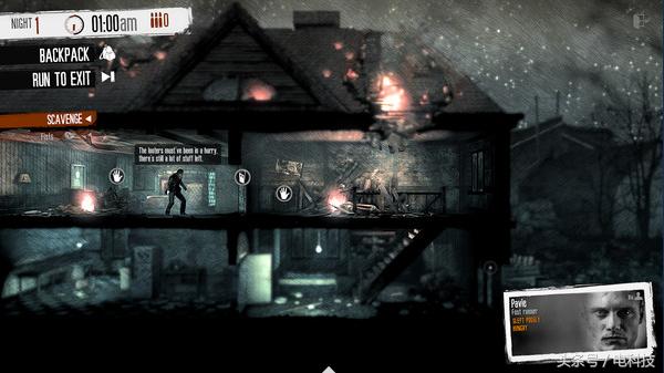 这就是《这是我的战争》的世界,一个在战争中遭遇围困的城市。我们所扮演的生存者没能及时逃出城外,他们的命运已经和这座城市捆绑在了一起。城市和战争都没有自己名字,我们大概可以将它理解成现代版的列宁格勒,只是此间并不像白夜之城那样拥有一个强有力的政权用粮食配给来维持秩序,在这里,可怜的居民们只能自谋生路。