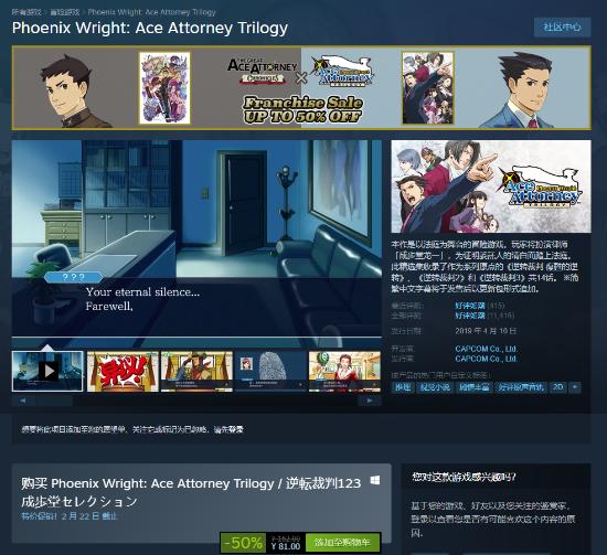 推理游戏《逆转裁判123:成步堂精选集》目前已在Steam商店开启五折优惠,仅需81元即可入库,折扣力度平史低。