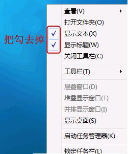 3,鼠标右键任务栏空白处,首先将锁定任务栏的勾去掉,然后在Quick Launch 的位置右键,把显示文本和显示标题的勾全部去掉。