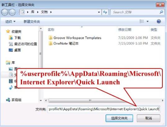 2,接在新建的文件夹里面输入:%userprofile%AppDataoamingMicrosoftInternet ExplorerQuick Launc,然后回车键,如图下所示;