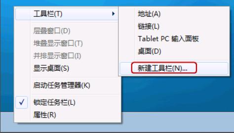 1,首先右键点击“任务栏”,在弹出的菜单栏中依次点击“工具栏”——>“新建工具”,如图下所示;