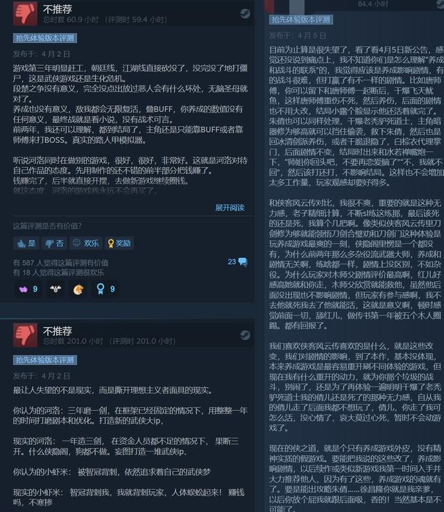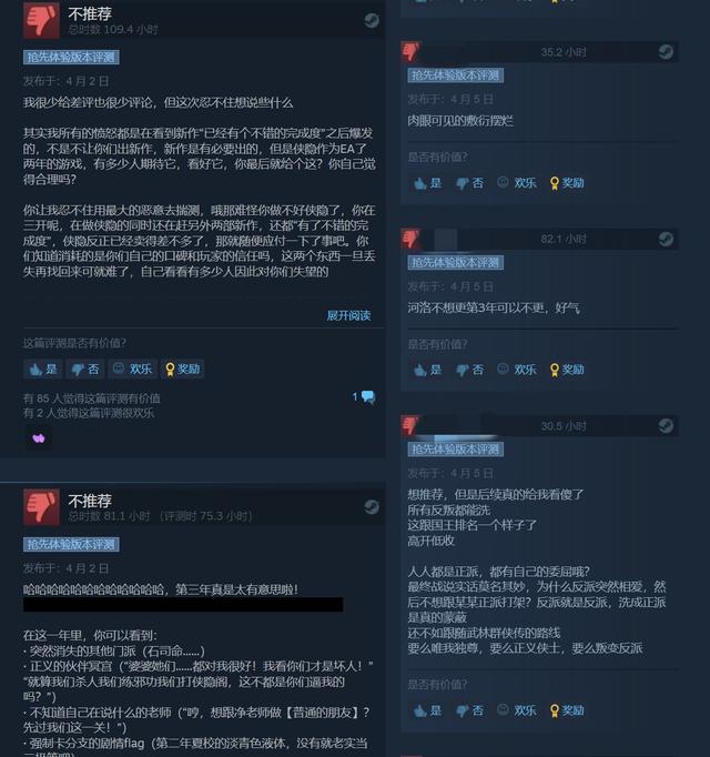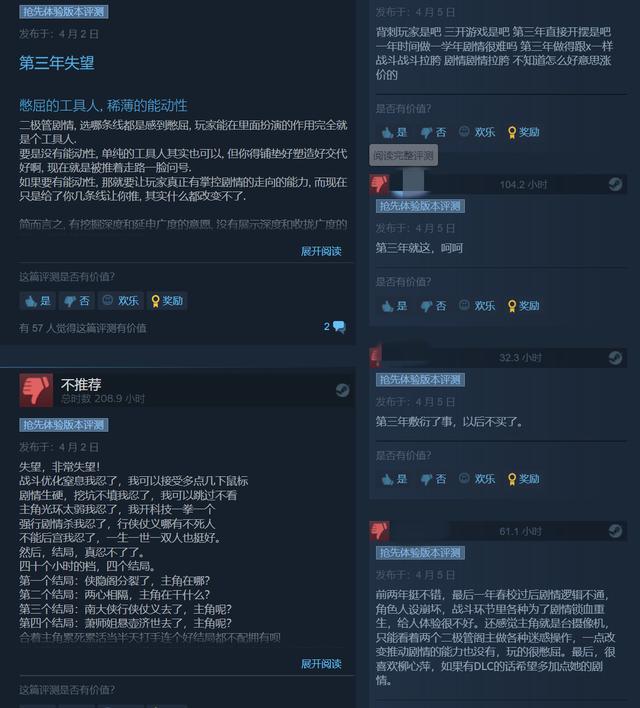 根据Steam图表,4月1日剧情大更新后,出现了大量差评。差评原因包括“剧情无脑圣母”、部分内容直接被砍掉,养成没有任何意义等等。