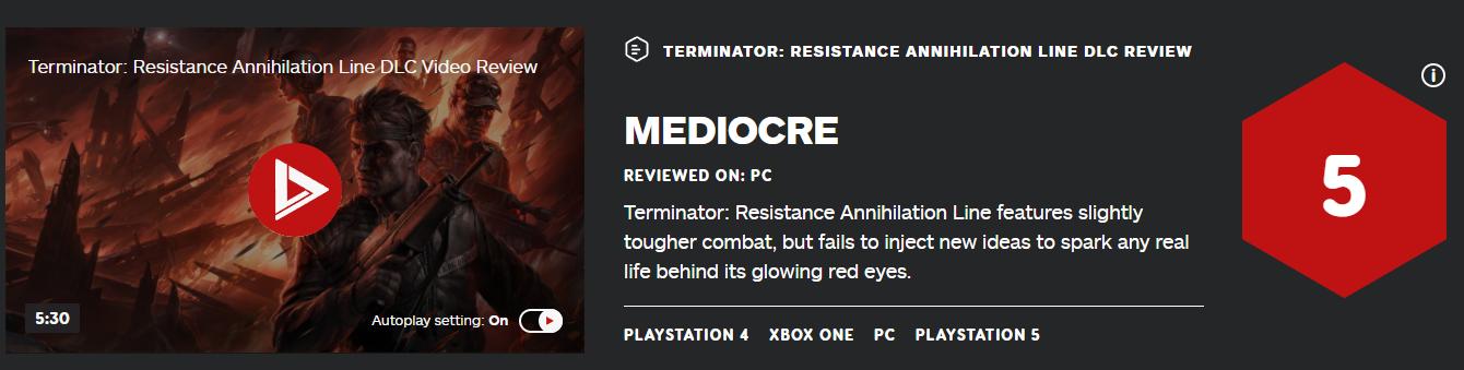 IGN为《终结者:反抗军》全新DLC打出了5分的评分,认为该作具有更加困难的战斗模式,但游戏没有注入新的玩法,显得无趣。