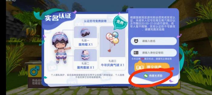 (图说:在《迷你世界》的实名认证环节,未成年人可向选择“向家长求助”功能。)
