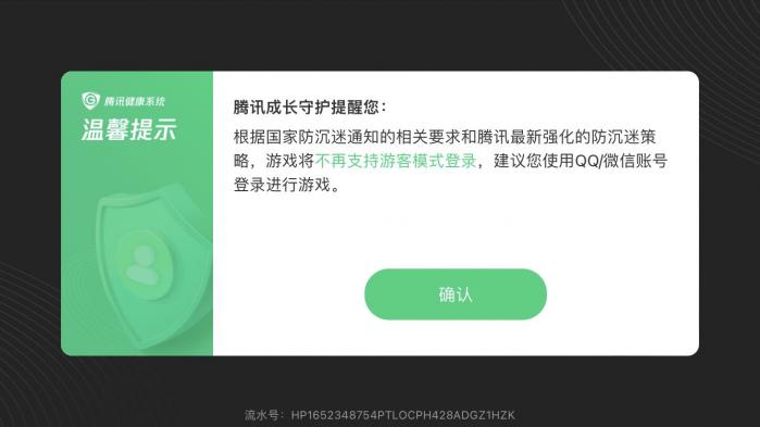 此外,受测的20款游戏中提供的游客模式均已取消或不可用。比如《王者荣耀》的界面上虽然仍然存在“游客模式”的选项,但在点击后,系统便会进一步提示:“腾讯成长守护提醒你:根据国家防沉迷通知的相关要求和腾讯最新强化的防沉迷策略,游戏将不再支持游客模式登录,建议您使用QQ、微信账号登录进行游戏。”
